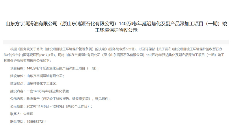 山東清源石化有限公司40萬噸/年變壓器油技改項目(一期)竣工環(huán)境保護驗收公示