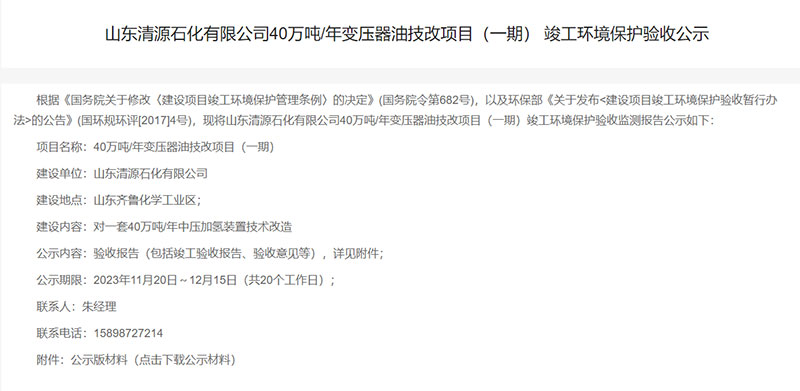 - 山東清源石化有限公司40萬噸/年變壓器油技改項目(一期) 竣工環(huán)境保護驗收公示